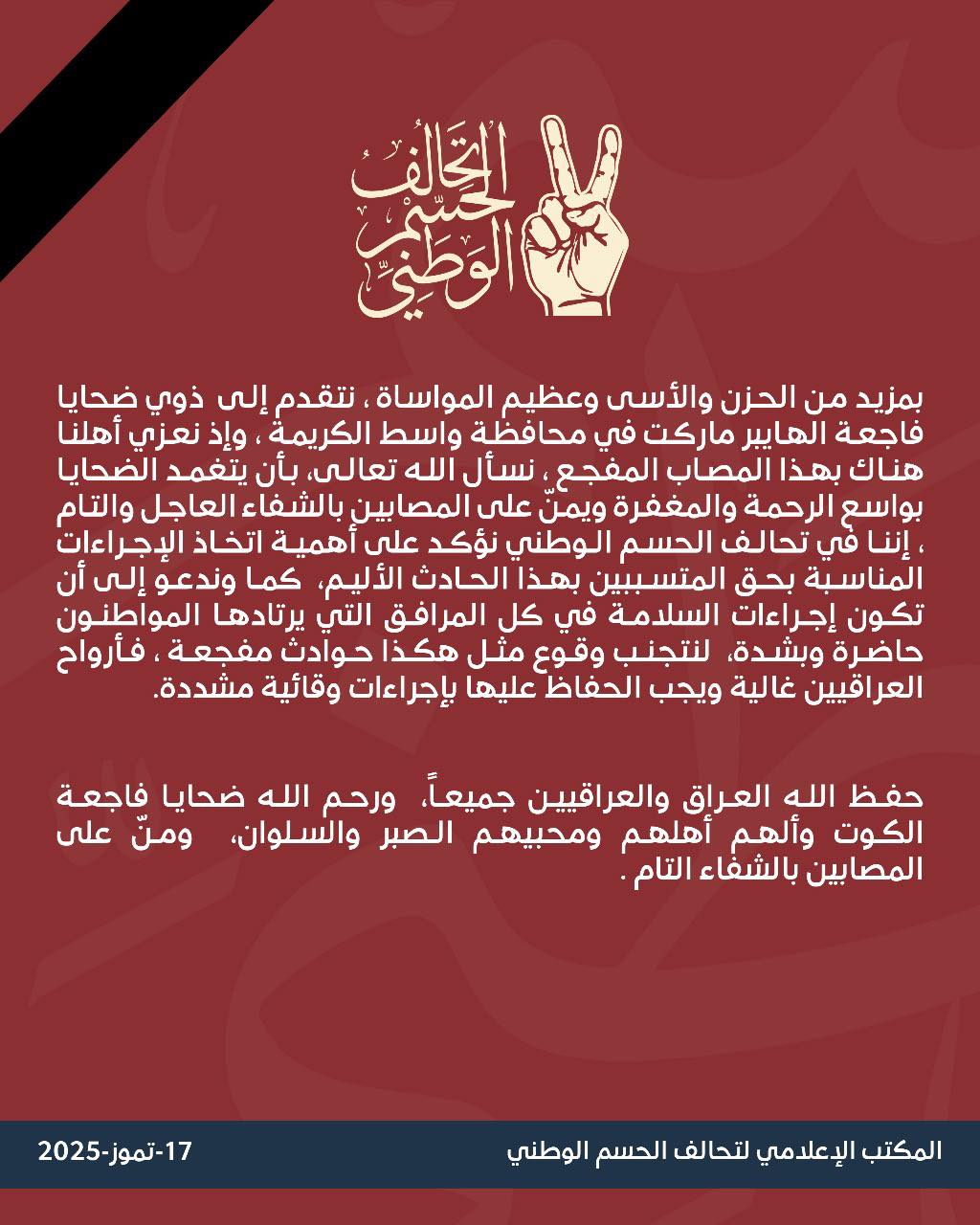 بيان تعزية ………. بمزيد من الحزن والأسى وعظيم المواساة ، نتقدم إلى ذوي ضحايا فاجعة الهايبر ماركت في محافظة واسط